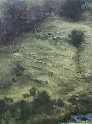 This body of paintings is a response to this wonderful landscape and to one of my walks in particular. My return walk to the gate takes me about 50 minutes. In less than an hour I can be back at work. It's a little over three miles and takes me from the studio through the most glorious undulating countryside of woodland and fields of grazing sheep up to a gate above the village of Kirkland. At the gate I usually turn back to the studio but beyond the gate the landscape opens out and it becomes much wilder and, for me, it's where wilderness begins. (see the paintings 'To the Limekiln' and 'Wildboar Nook')